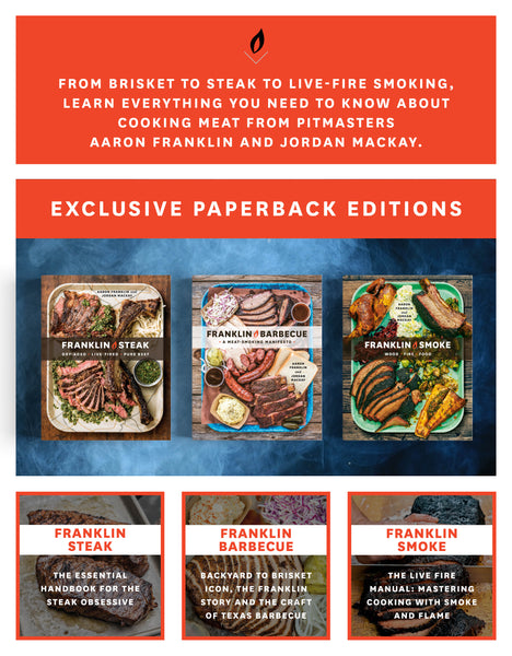 Paperback book set containing all three of Aaron's books, including Franklin Barbecue: A Meat-Smoking Manifesto, Franklin Steak and Franklin Smoke.